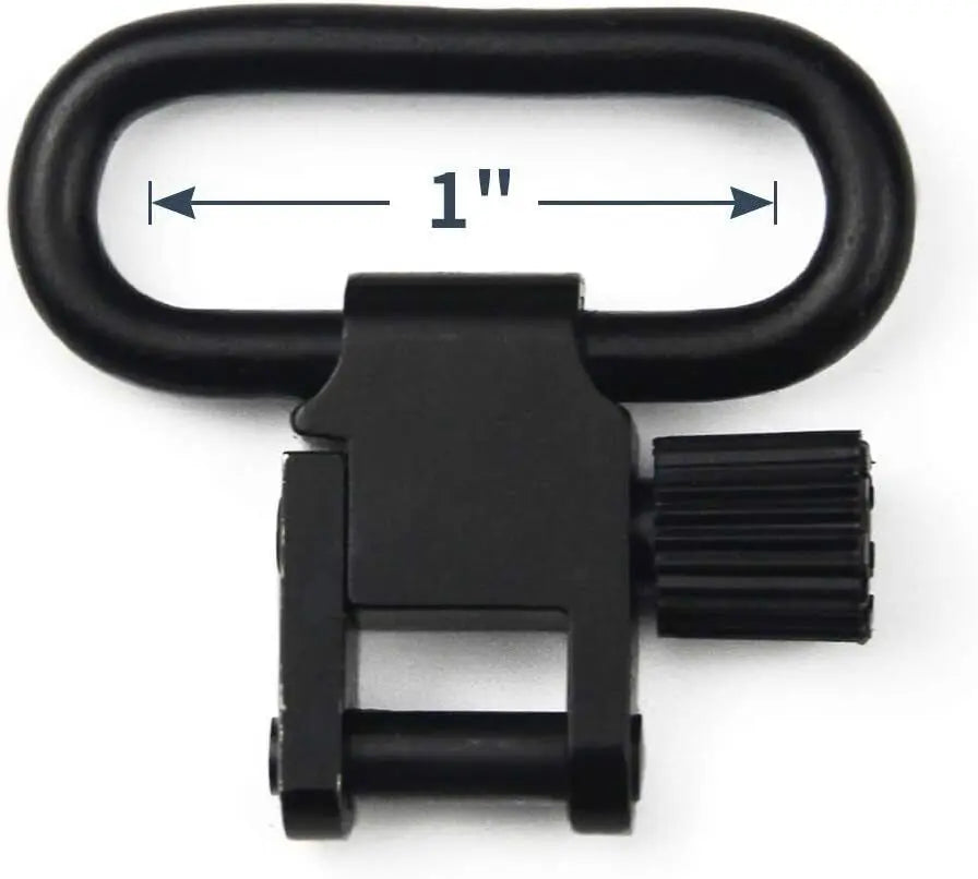 The unique quick detachable design stops the steel swivel body from contacting the gun. The close machining tolerances provide smooth and silent operation. For end adapter with stud installed in the barrel band of gun. Swivel lock spring-loaded plunger and a knurled, threaded sleeve eliminates accidental opening of the swivel.