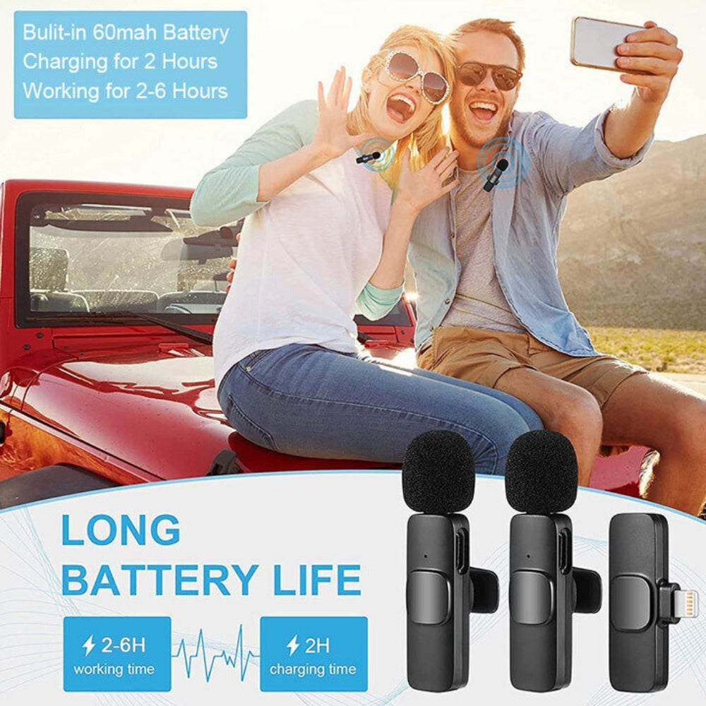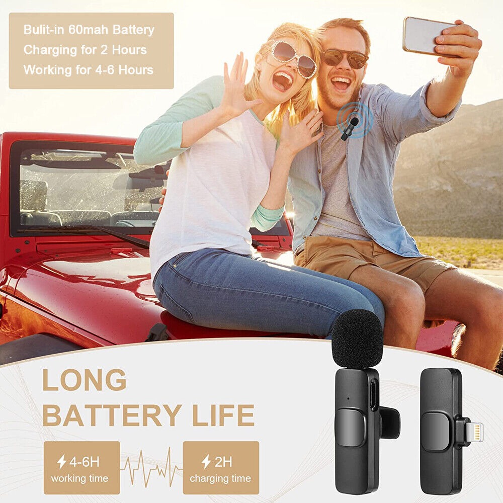 【Universal wireless system】The receiver is powered by the phone, and the transmission microphone has a built-in rechargeable battery for up to 10 hours of operation. 20M working distance without cable, 0.009s transmission delay.