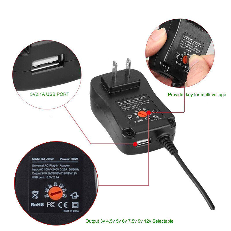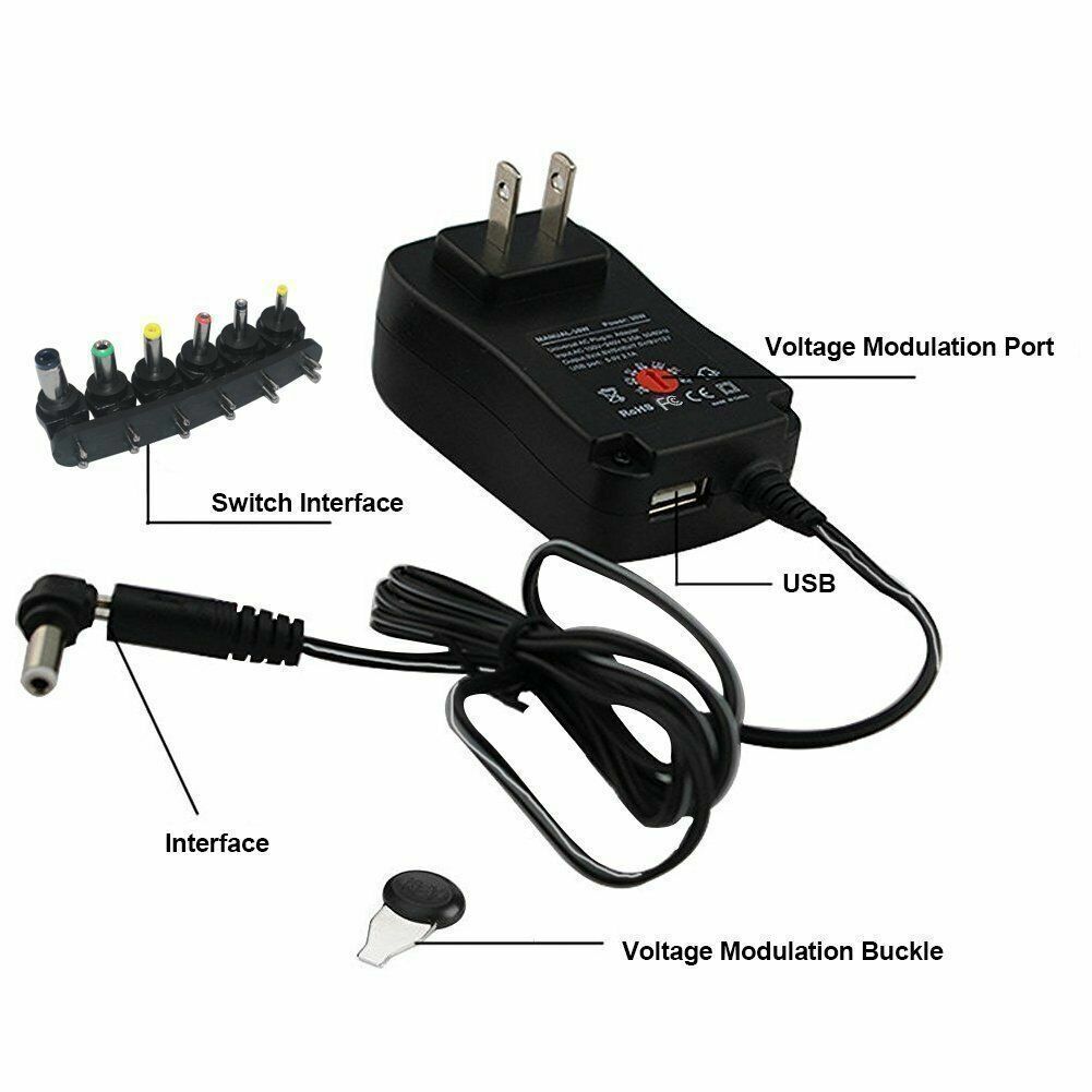 ✅ Universal AC/DC Adapter - AC Input:100-240V 0.2A 50/60Hz, DC Output:3V/4.5V/5V/6V/7.5V/9V/12V. Advanced secure technique, with full PROTECTION of over Voltages/ over Current/ short Circuits/ over Temperature.