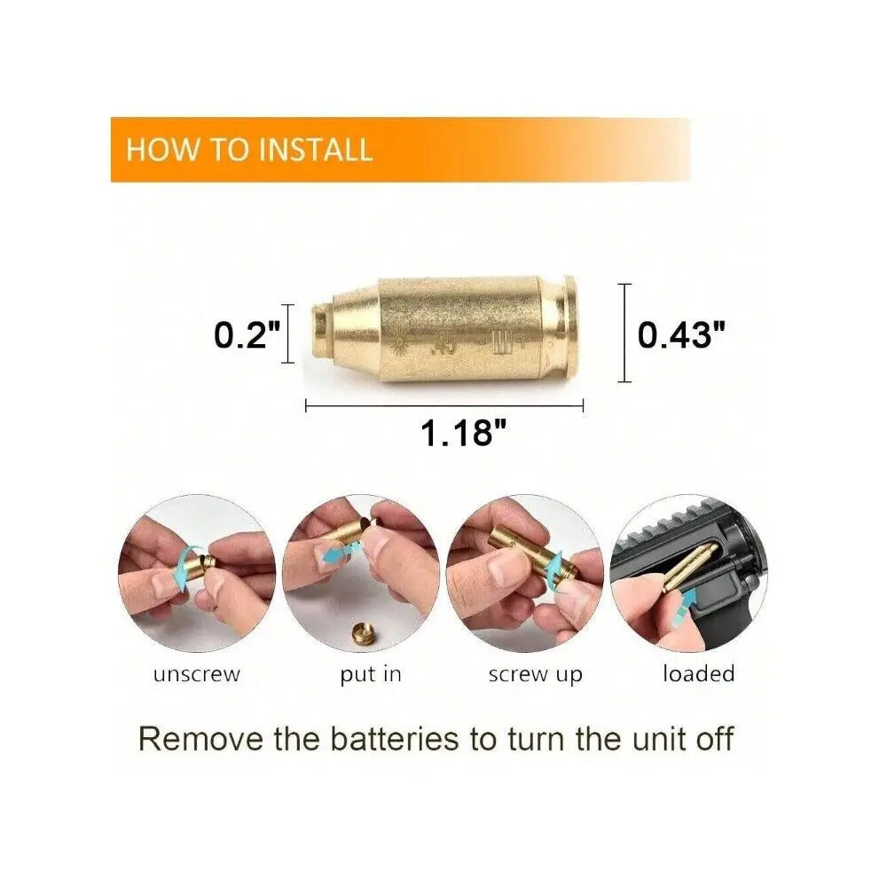 Works with scopes, holographic red dot sights, and variety sights. Durable, machined brass housing looks like a cartridge case but actually contains the entire laser system and batteries.