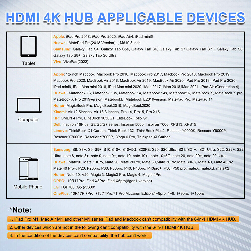-4K 30 Hz or 2K 60 Hz displays are supported by the HUB HDMI-compatible Port. The Type-C to HDMI-compatible Adapter lets you extend the screen of your device and receive images in 4K UHD or full HD 1080P on HDTVs and PC Monitors or Projectors.