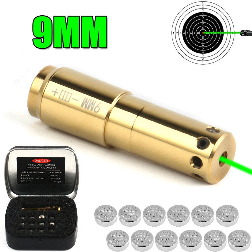 9mm Green Laser Bore Sight Cartridge Boresight Dry Fire Shooting Training Brass 12Pcs Batteries Included