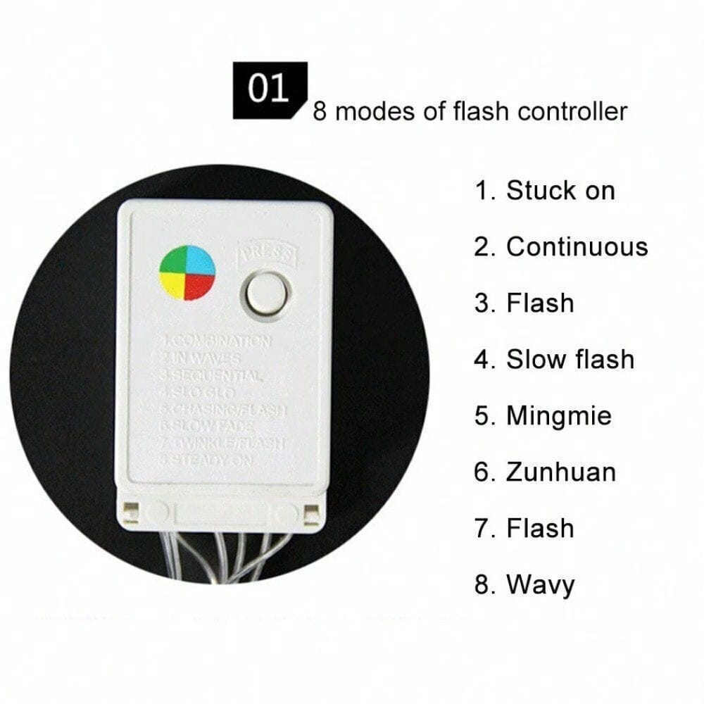 8 Lighting Modes: Combination, In Wave, Sequential, Slo Glo, Chasing/ Flash, Slow fade, Twinkle/Flash, Steady On. And brightness dimming and timer, it is very easy and convenient.