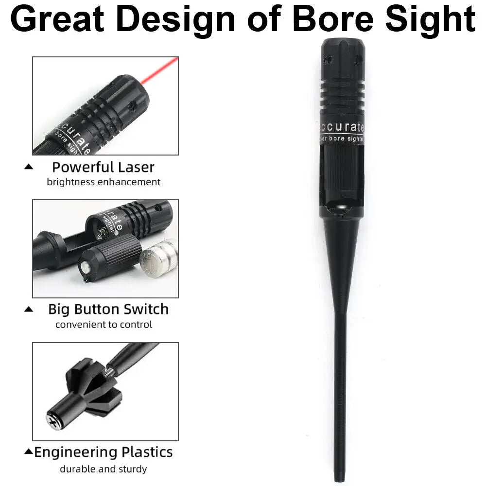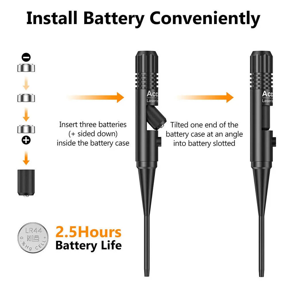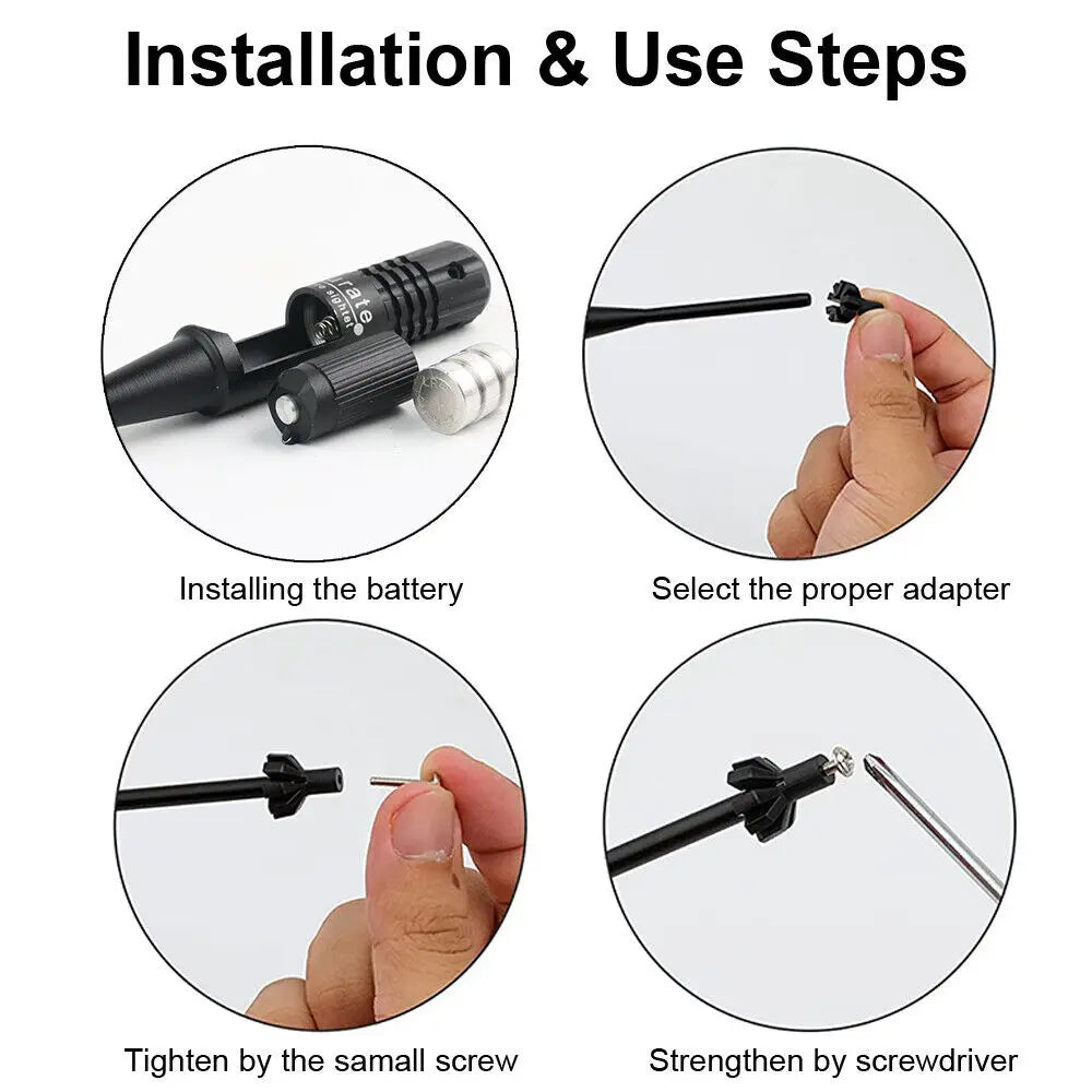 【Easy to Use】 laser bore sighter has been calibrated before leaving the factory, no further adjustments required. .Select the appropriate adapter and attach it to the narrower end of the bore sighter. Insert the bore sighter into the barrel of your firearm. To activate the red laser, simply press the power button once.