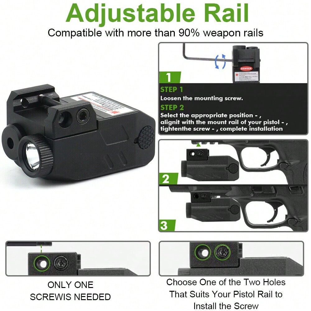 【Two Versatile Settings】 - Flashlight includes steady on/strobe modes. Working modes: Steady/Strobe light, Pistol laser Only, Steady/Strobe Flashlight+ Green Laser, Green laser beam can be adjusted vertically and horizontally. The package contains a small wrench, which can be inserted into the hole to adjust the accuracy of the green dot,The green laser light combo is very powerful and can be seen at distances of up to 200 meters!