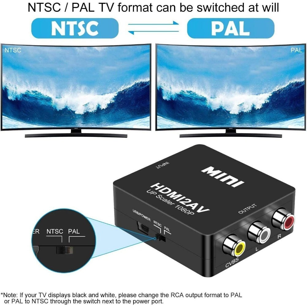 The MINI HDMI to AV audio signal converter can convert HDMI video signal or audio signal to AV compo sit video signal and the FL/ FR stereo audio signal, can convert the high quality HDMI video signal into normal CVBS signal(standard-definition 480i, 576i) Which can Play on TV, VHS VCR,DVD recorders etc, and support NTSC, PAL TV Format .