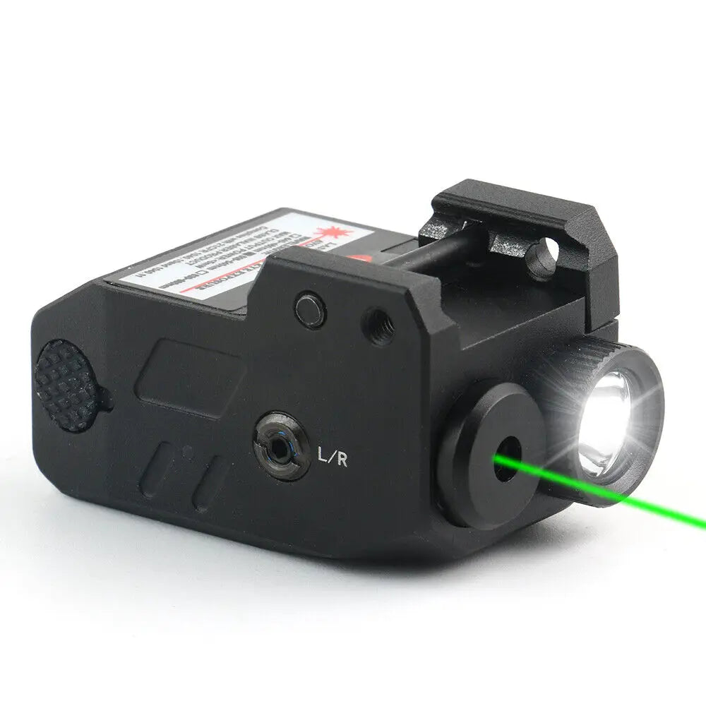 【Two Versatile Settings】 - Flashlight includes steady on/strobe modes. Working modes: Steady/Strobe light, Pistol laser Only, Steady/Strobe Flashlight+ Green Laser, Green laser beam can be adjusted vertically and horizontally. The package contains a small wrench, which can be inserted into the hole to adjust the accuracy of the green dot,The green laser light combo is very powerful and can be seen at distances of up to 200 meters!