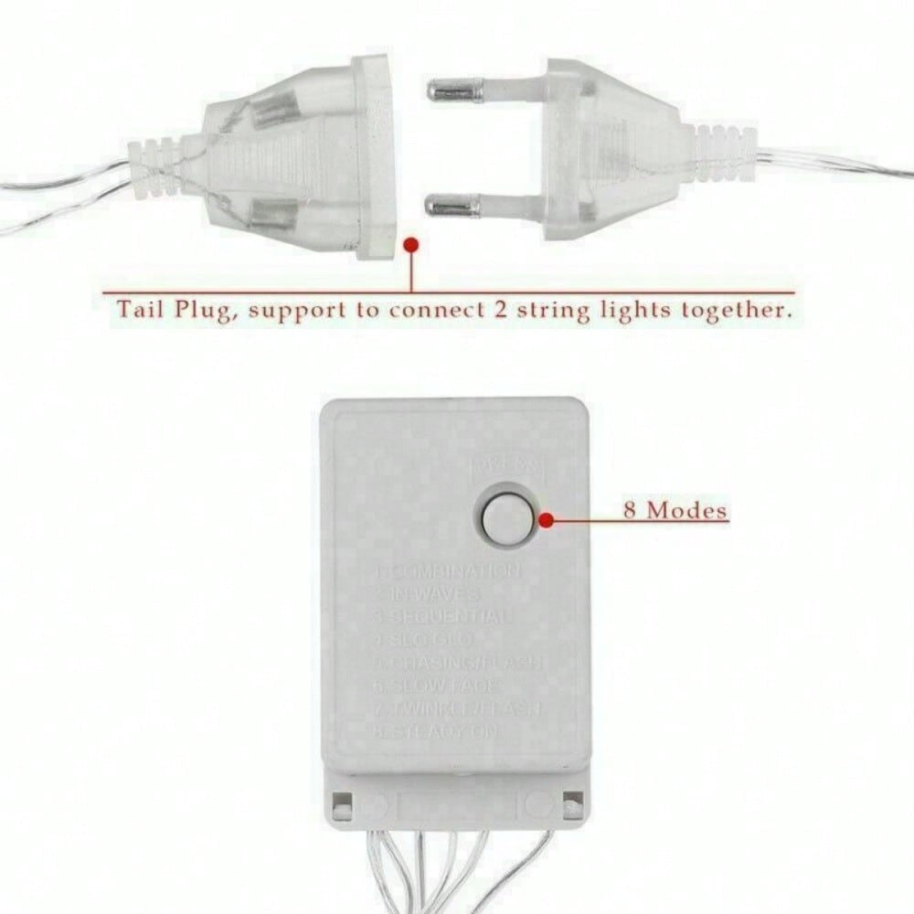 - Every string has 8 different modes: combination, in waves, sequential, SLO GLO, chasing/flash, slow fade, twinkle/flash, and steady on.