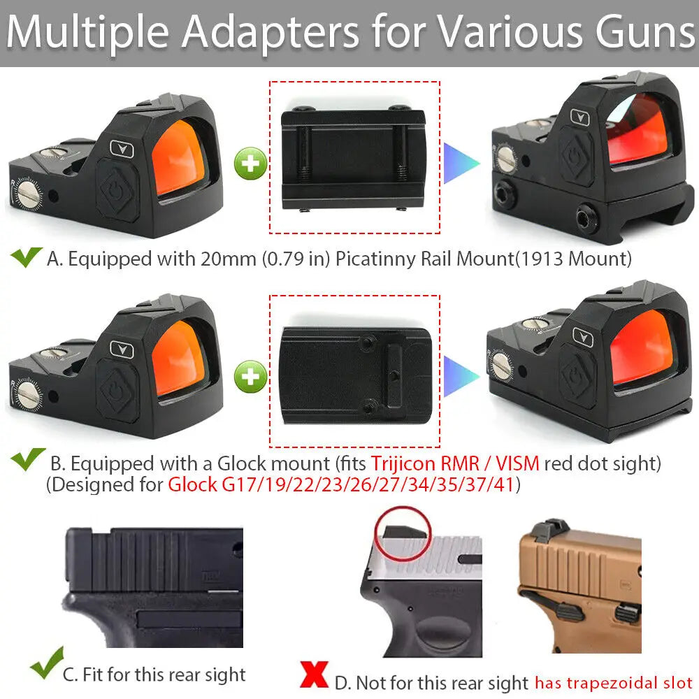 【Multifunction Desigh Mounts】The Reflex Sight use integrated mount for standard 20mm Picatinny or Weaver rails which will not loose, made to last.Alternatively, replace the original pistol physical sight with an included low profile mounting adapter and mount the red dot sight on its top.Please pay attention to the size of adapter and make sure it fits your gun.