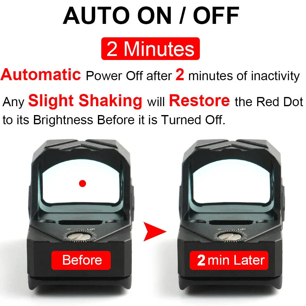 【Shake Awake Function】Automatically Turn off After 2 Minutes of Inactivity.Any Slight Shaking will Restart.The Memory Function will Restore the Red Dot to its Brightness Before it is Turned Off.12 Illumination Settings Allow Shooters to Change the Dot Intensity to the Situation at Hand.Battery Life up to 50K Hours.(At the Lowest Brightness)