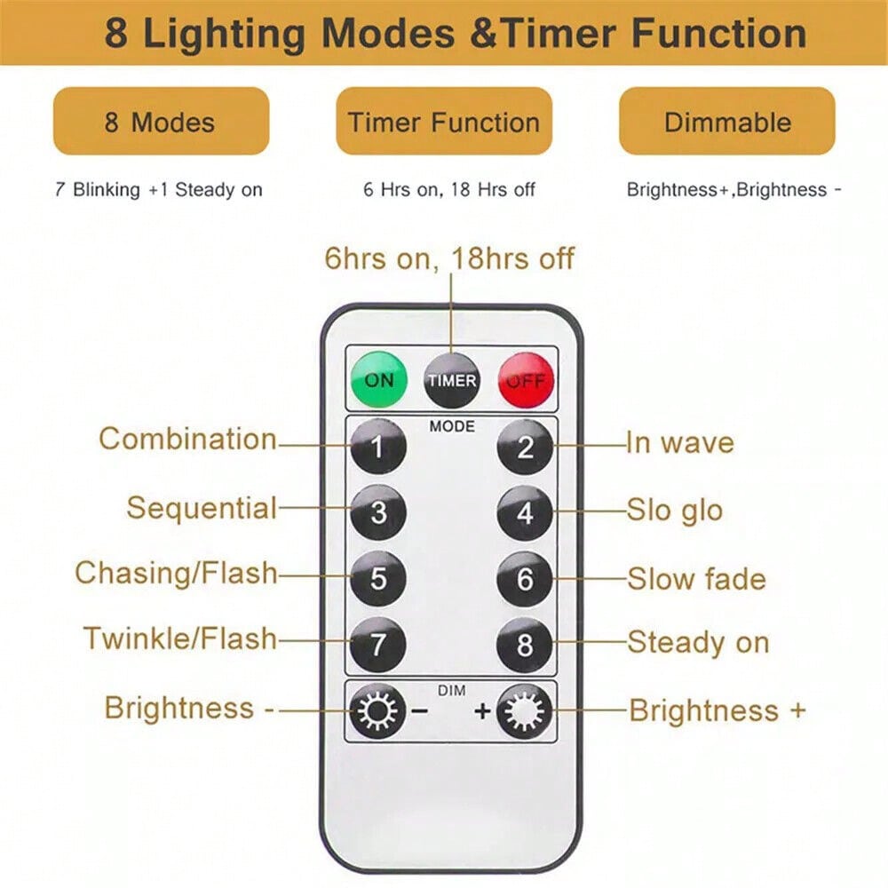 [8 Light Effects]The options for how the 300 LED fairy lights shine are great, you can pick any modes you like, combination, wave, fading, chasing, slow flashing, flashing and steady light,which can create different atmospheres for your life.