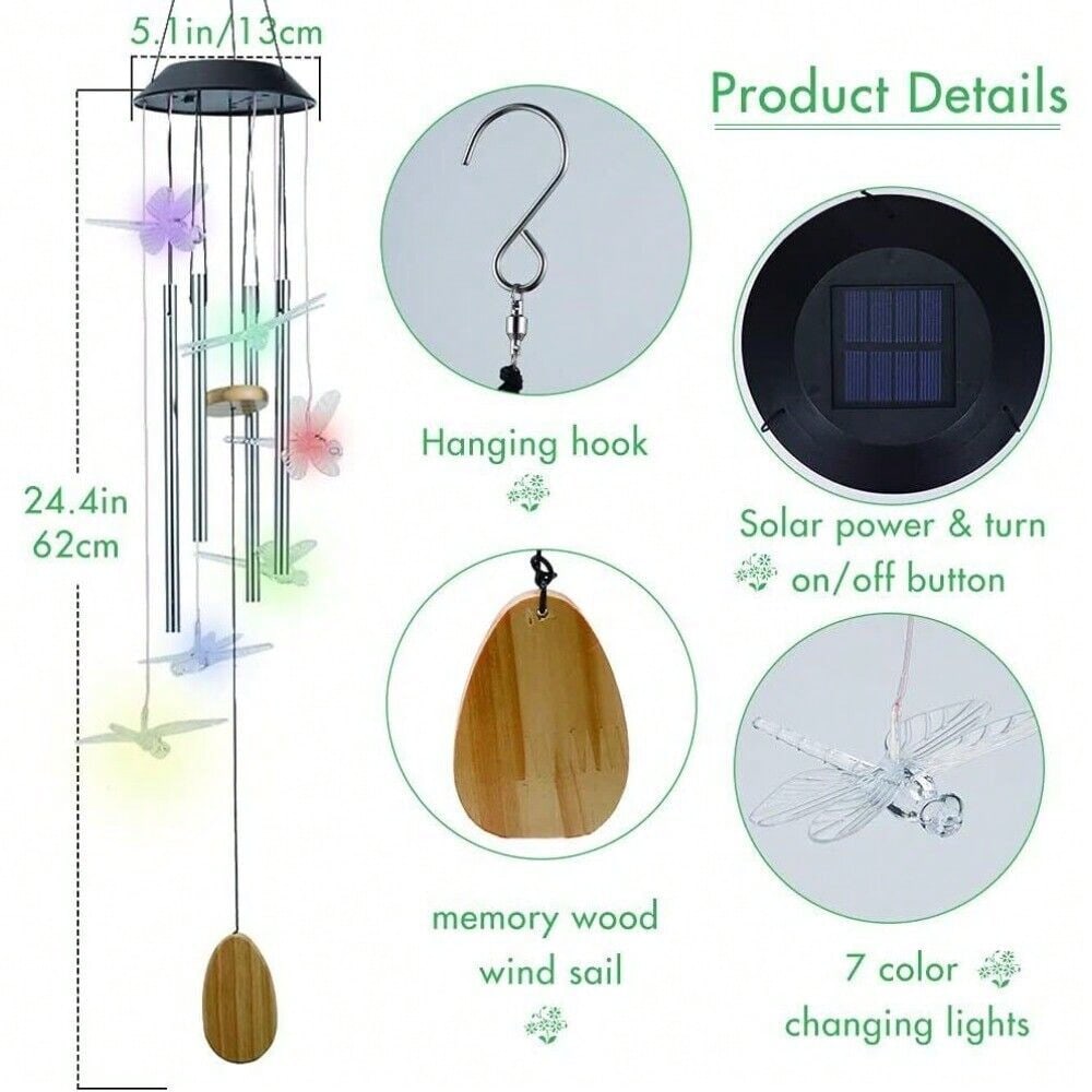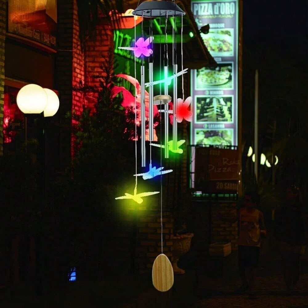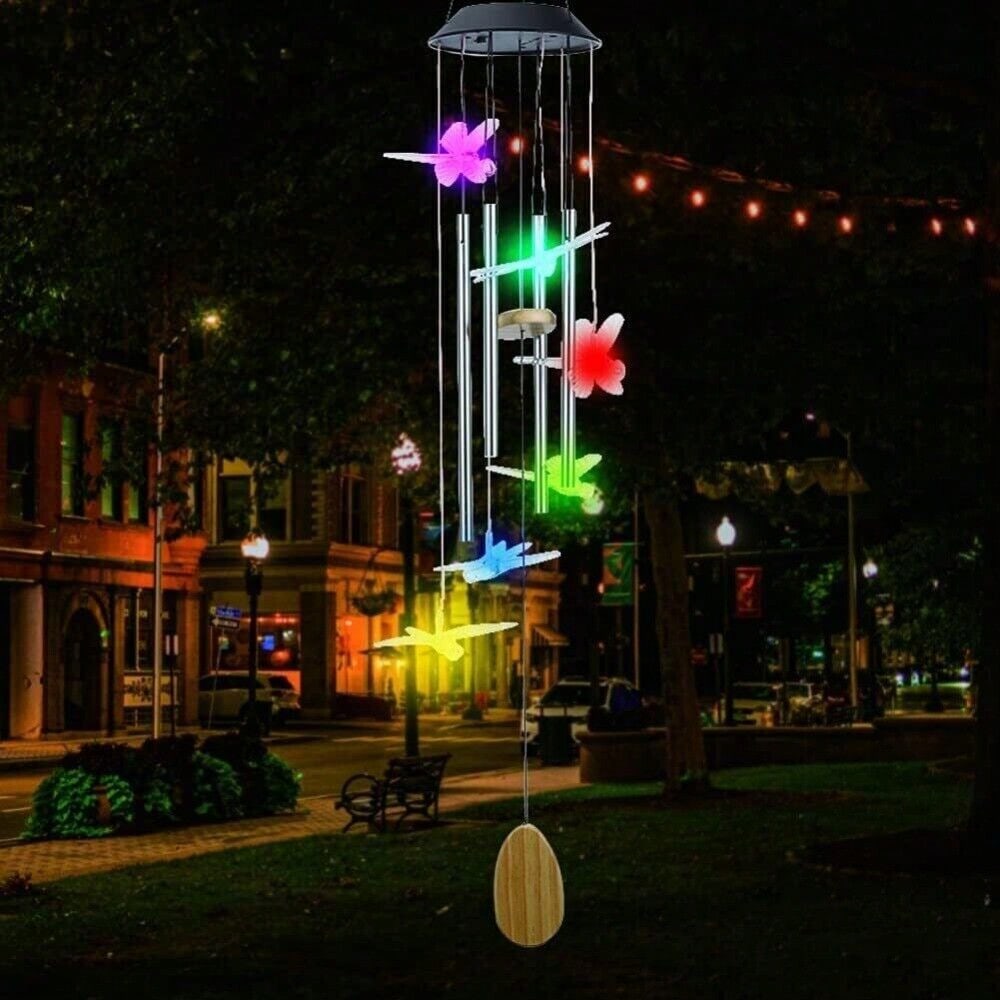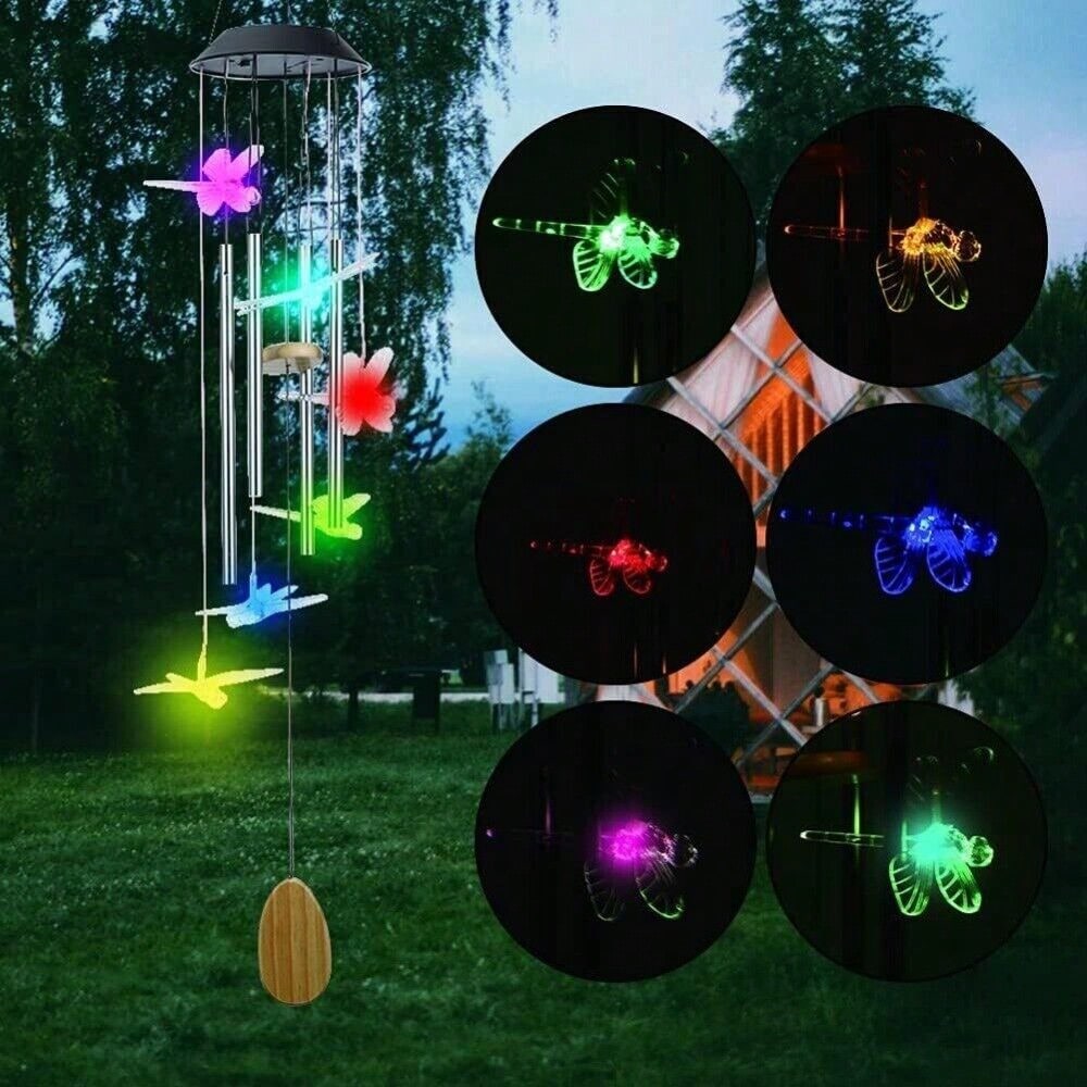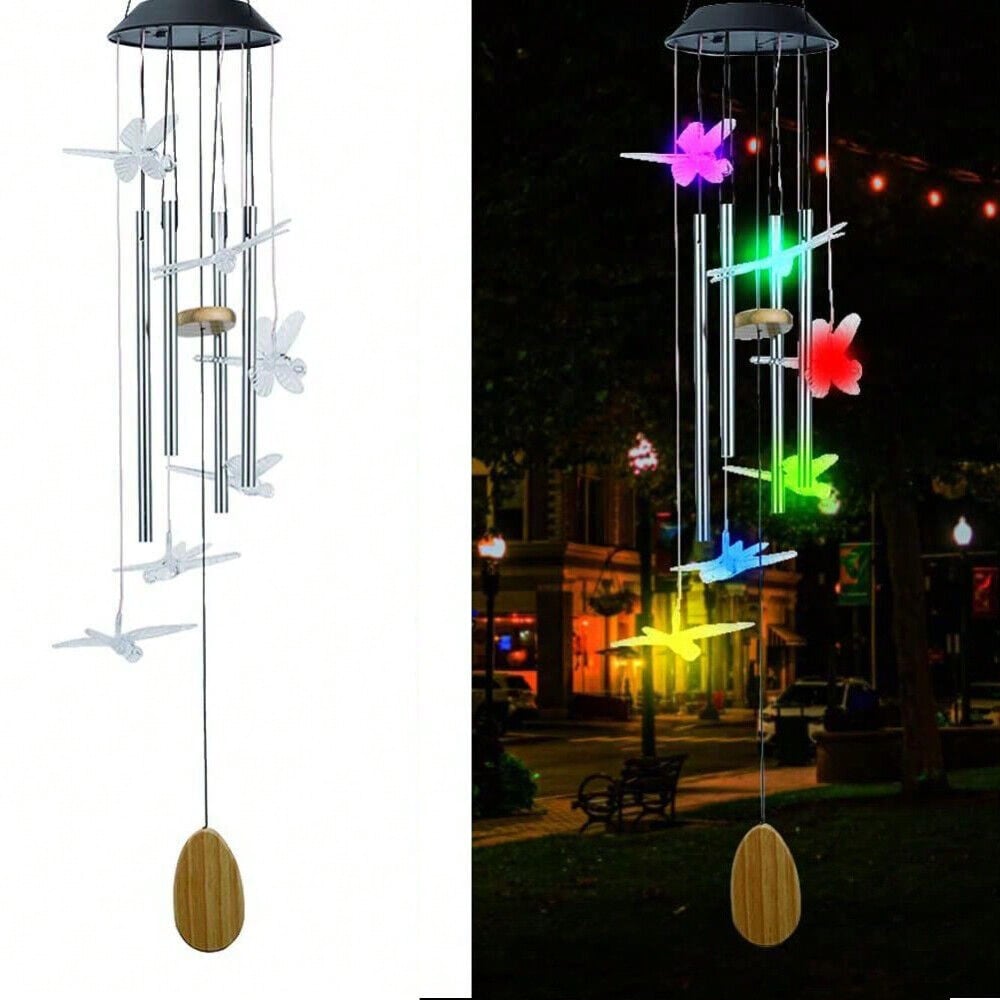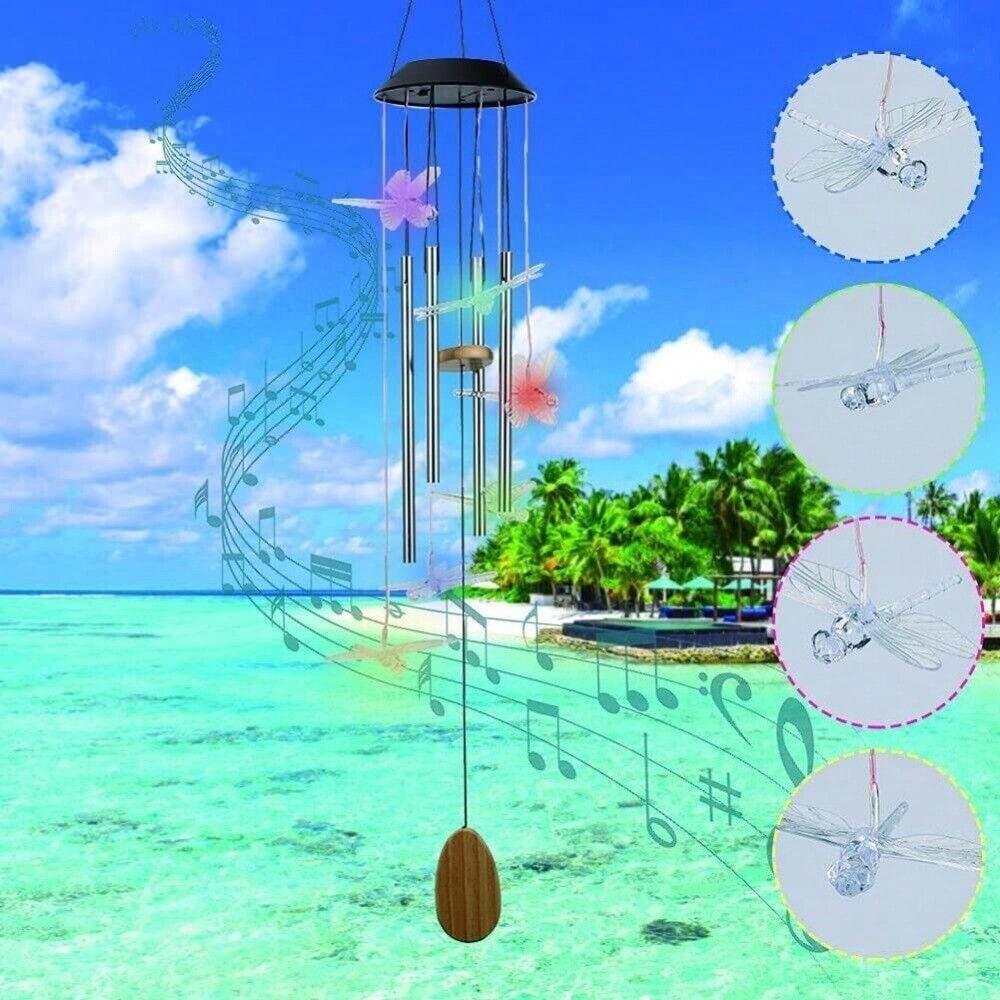 Solar Wind Chimes LED Color Changing Dragonfly Commemorative Wind Chimes 4 Tubes
