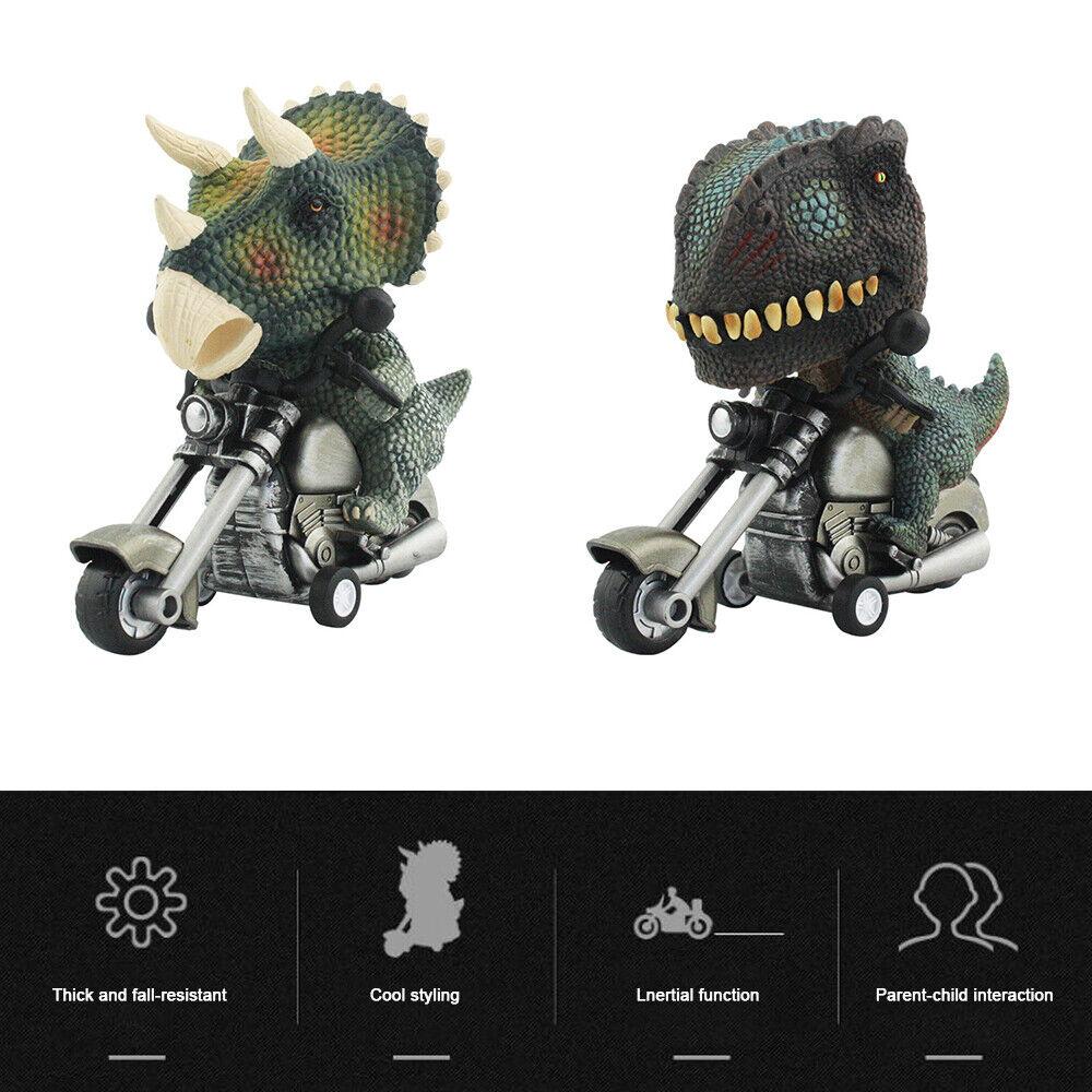 About this item [4-Pack DINOSAUR MOTORCYCLES] Dinosaur friction-powered toy cars featuring 4 big head dinosaur rider motorcycles. Dinosaurs include T-Rex and Triceratops, rhinoceros and great white shark. The design of realistic dinosaur and vehicle combination makes a cool dinosaur toy for boys.