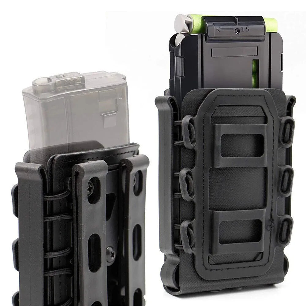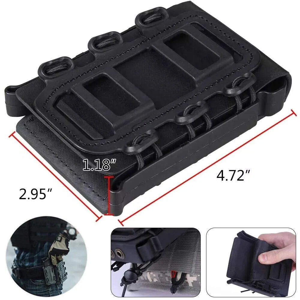 - MATERIAL: This 5.56mm, 7.62mm mag pouch is made of high quality plastic and soft shell rubber with adjustable bungee cord to fit your magazines well.