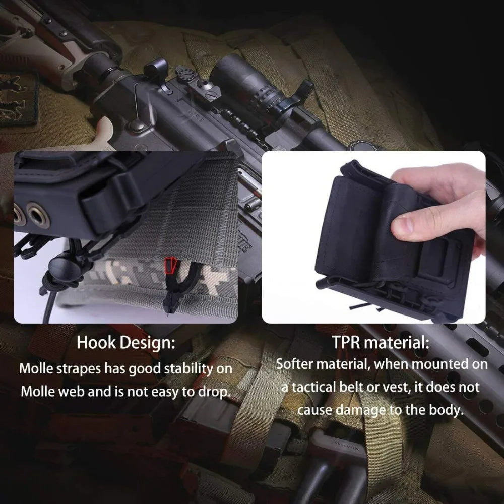 - MOLLE EXTENSION SYSTEM: Reduces reload cycle time,it is easy to access and slologht twist draws magazine out for quick reload. Able to attach to any molle webbing vest, bag, belt or backpack. Adjustable bunge cord to fit and lock.