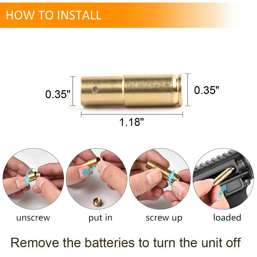 Insert the batteries and screw the cap on the housing to turn on the laser; remove the batteries to turn off. Insert the entire assembly into the chamber, gently close the action, and aim at a target 20-30 yards away. Adjust windage and elevation of the scope or sights so point-of-aim is zeroed on.
