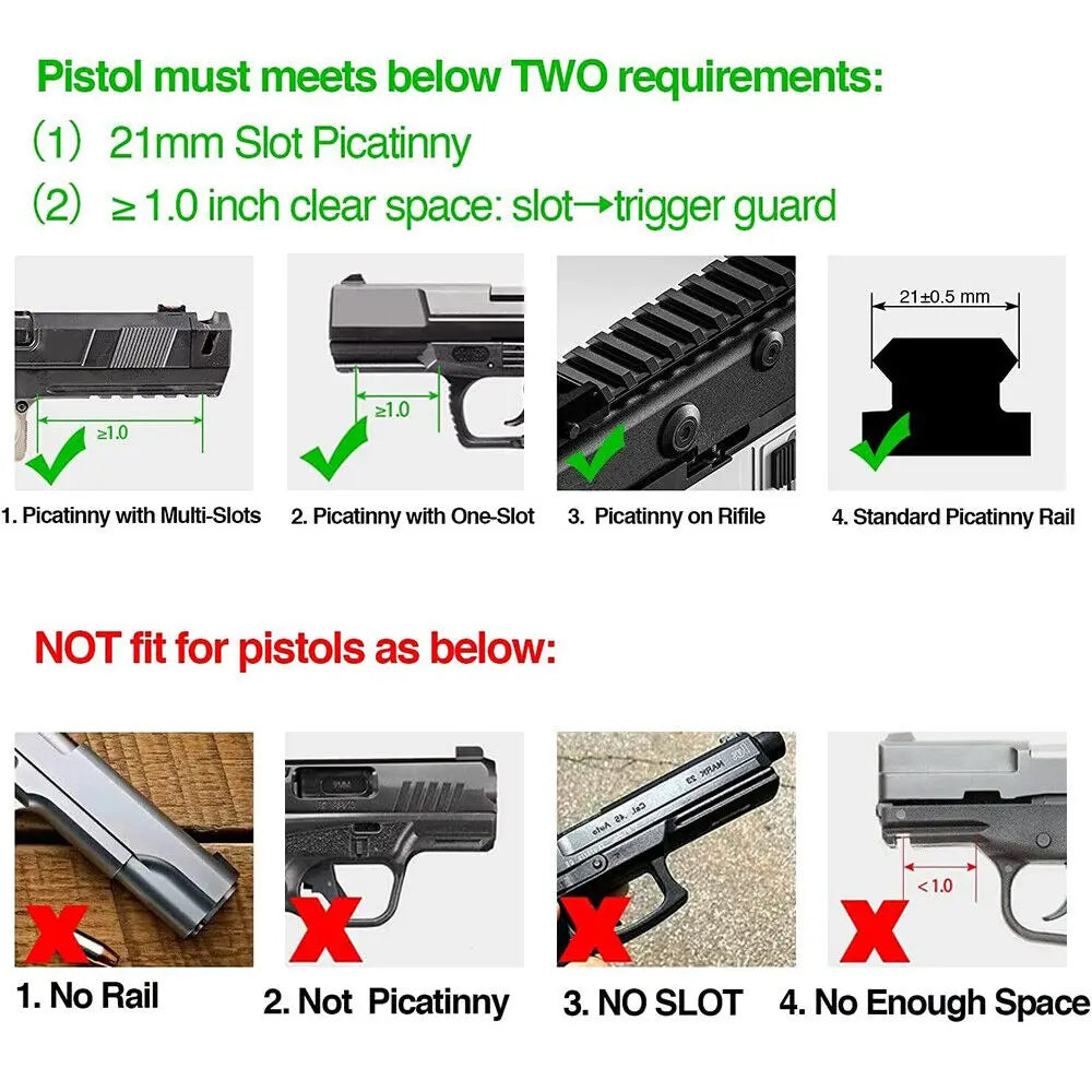 【High-quality Aviation Aluminum Alloy】This red laser sights for pistols is exquisitely crafted with aviation aluminum alloy, it has excellent corrosion resistance, high toughness and lightweight, can use on different enviroment.