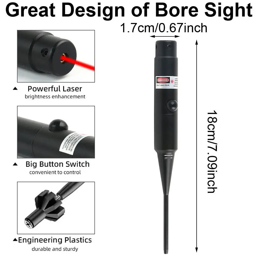 [Easy To Use] Simply choosing appropriate size adapter and place the bore sighter in the barrel . Just sightly press the button switch ,a bunch of strong Red/ Green beam will be emitted straightly .Caution:Keep boresighter kit laser pointing away from eyes.